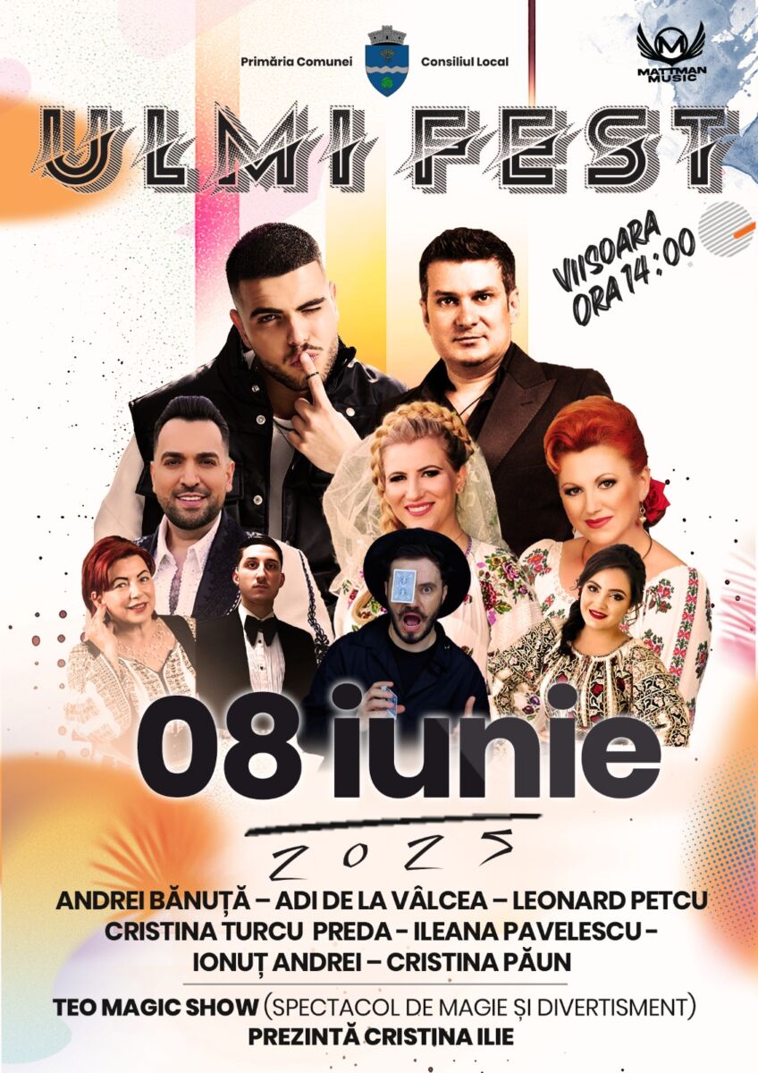 Am plăcerea de a vă invita cu drag la Ulmi Fest 2025, o zi de sărbătoare dedicată comunității noastre minunate! Pe scena festivalului vor urca artiști îndrăgiți:Andrei Bănuță, Adi de la Vâlcea, Cristina Turcu Preda, Leonard Petcu și multe alte surprize muzicale care vă vor bucura sufletul! Cei mici vor avea parte de un program special, plin de magie, jocuri, activități distractive și multă voie bună! Vă așteptăm în număr cât mai mare să petrecem împreună o zi de neuitat, plină de bucurie!” transmite Bogdan Tița, primarul comunei Ulmi.