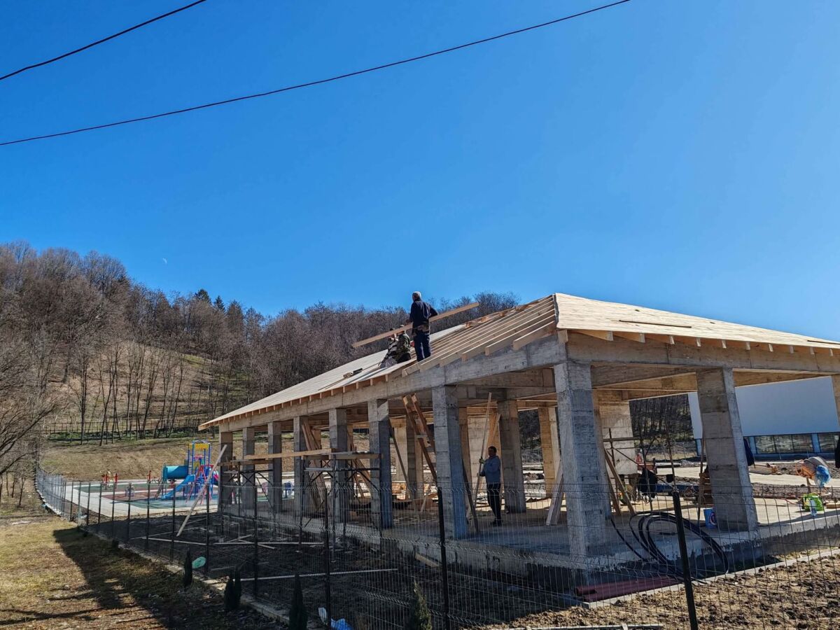 La obiectivul ”Înființare zonă de agrement și petrecere a timpului liber în comuna Vulcana-Pandele, sat Gura Vulcanei”, realizat prin Programul Județean de Dezvoltare Locală, se montează astereala la acoperișul foișorului și se realizează platformele pentru montarea băncilor.