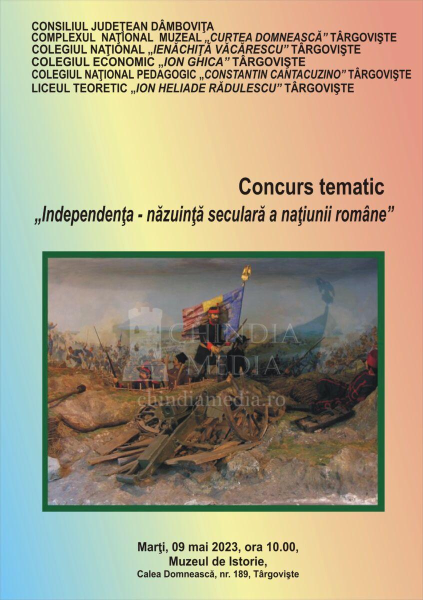Consiliul Județean Dâmbovița, prin Complexul Național Muzeal „Curtea Domnească” Târgoviște, organizează marți, 9 mai 2023, ora 10:00, la Muzeul de Istorie din Târgoviște, concursul tematic intitulat „Independența, năzuință seculară a națiunii române”.