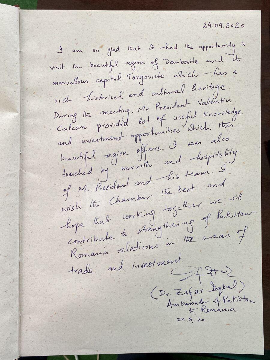 Astăzi, 24 septembrie 2020, Președintele Camerei de Comerț, Industrie și Agricultură Dâmbovița, domnul Valentin Calcan, a primit vizita E.S. dl. Zafar Iqbal, Ambasadorul Extraordinar și Plenipotențiar al Republicii Islamice Pakistan în România.