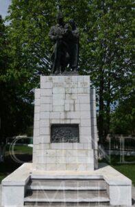 Postamentul lateral, spre școala nouă este reprezentat de o placă de marmură cu inscripția: „Ostaș ! Soldat necunoscut!/ Ce nume-ar fi să te slăvească!/ Tu te-ai luptat și ai căzut/ Acolo unde te-ai născut/ Pe sfânta brazdă părintească”, și o placă de bronz reprezentând plecarea soldaților români pe front și despărțirea de cei dragi.