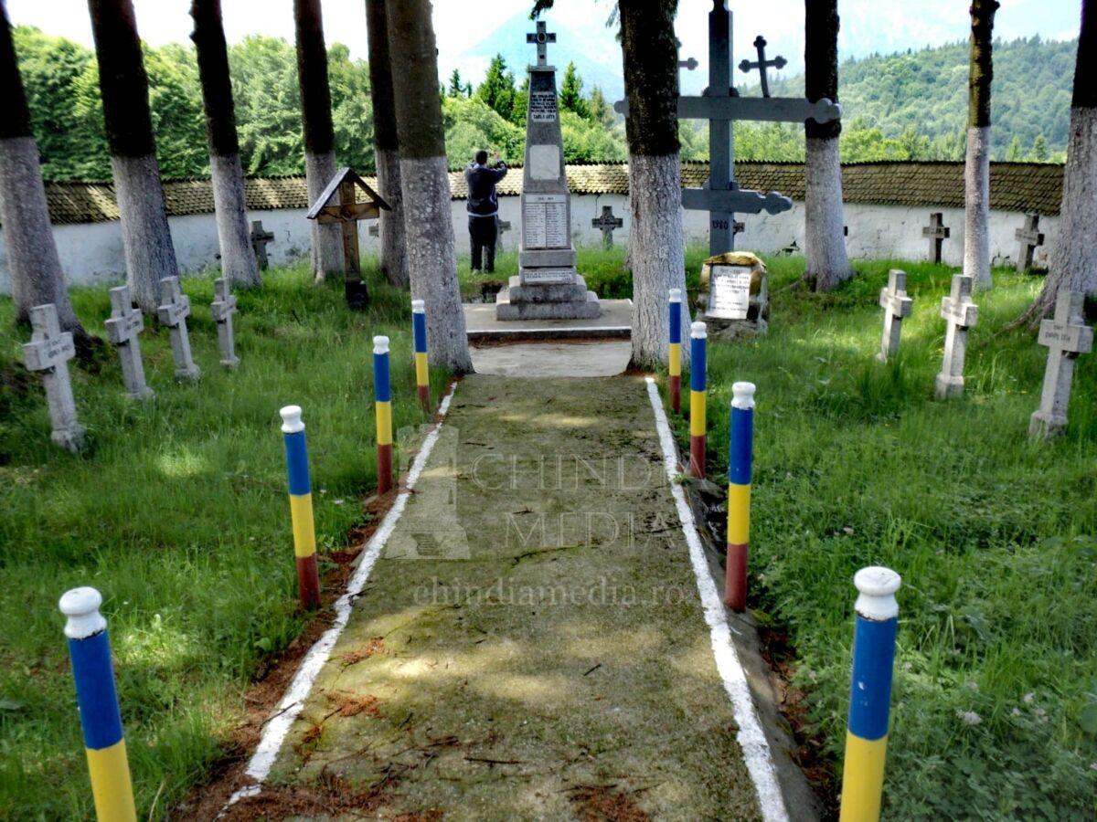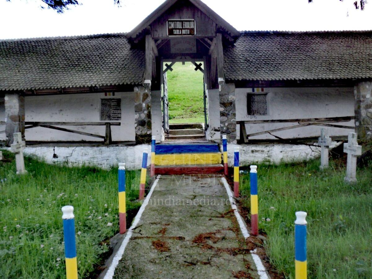 Imediat cum pătrunzi în Cimitirul de Enoare de la Tabla Buții, pe zidul interior de sub șarpantă, în partea dreaptă, dar și în partea stângă a intrării, sunt amenajate în două firide și încrustate în zid pentru eternitate, două plăci din marmură, unde sunt inscripționate numele eroilor pe câte două coloane. Astfel, pe placa din dreapta, se poate identifica următorul text: „În anul mântuirei 1916 când goarna adunării românismului la un loc a sunat și în urma marșului redeșteptării naționale, în Ardeal fiind siliți de forțe numeroase, dușmane a ne retrage trupele la hotare – puhoiul germano-austro-ungar a fost oprit pe Plaiul Tabla Buții, de Reg. 28 Inf, Bat. 24 Inf, 1 Div. Reg. 6 Art. 5 Bat. Din A II. Art.grea, 1 Bat. Din 72 Miliție și Comp. 5 A Pion. În urma luptelor îndârjite de la 2-6 octombrie pentru reocuparea frontierei, Tabla Buții, 4-6 și și 26 octombrie pentru stăpânirea Tătarelor și M. Colțul au căzut la Tătarul Plaiul Cetățuia, V. Stanici, 5 ofițeri și (…ostași), apărând sfânta noastră glie, cari se odihnesc sub cele lespezi de piatră de sub colină la un loc cu inamicul răpus, concretizând chiar în mormânt generozitatea blândului nostru popor”. În coloana din partea stângă sunt încrustate cu litere de 3 cm, numele a cinci ofițeri și data când au căzut la datorie, după cum urmează: „Nisipeanu Remus, căpitan, 6 octombrie 1916; Coropcărescu Ion, locotenent în rezervă, 2 octombrie 1916; Andreescu Ion, sublocotenent, 6 octombrie 1916; Mateescu Anastase, sublocotenent în rezervă, 3 octombrie 1916; Mihai Gheorghe, sublocotenent în rezervă, 3 octombrie 1916”. În continuare, pe placa din partea stângă, sunt trecuți pe două coloane toți morții din Campania 1916-1918 la Tabla Buții, adică un număr de 72 de eroi.