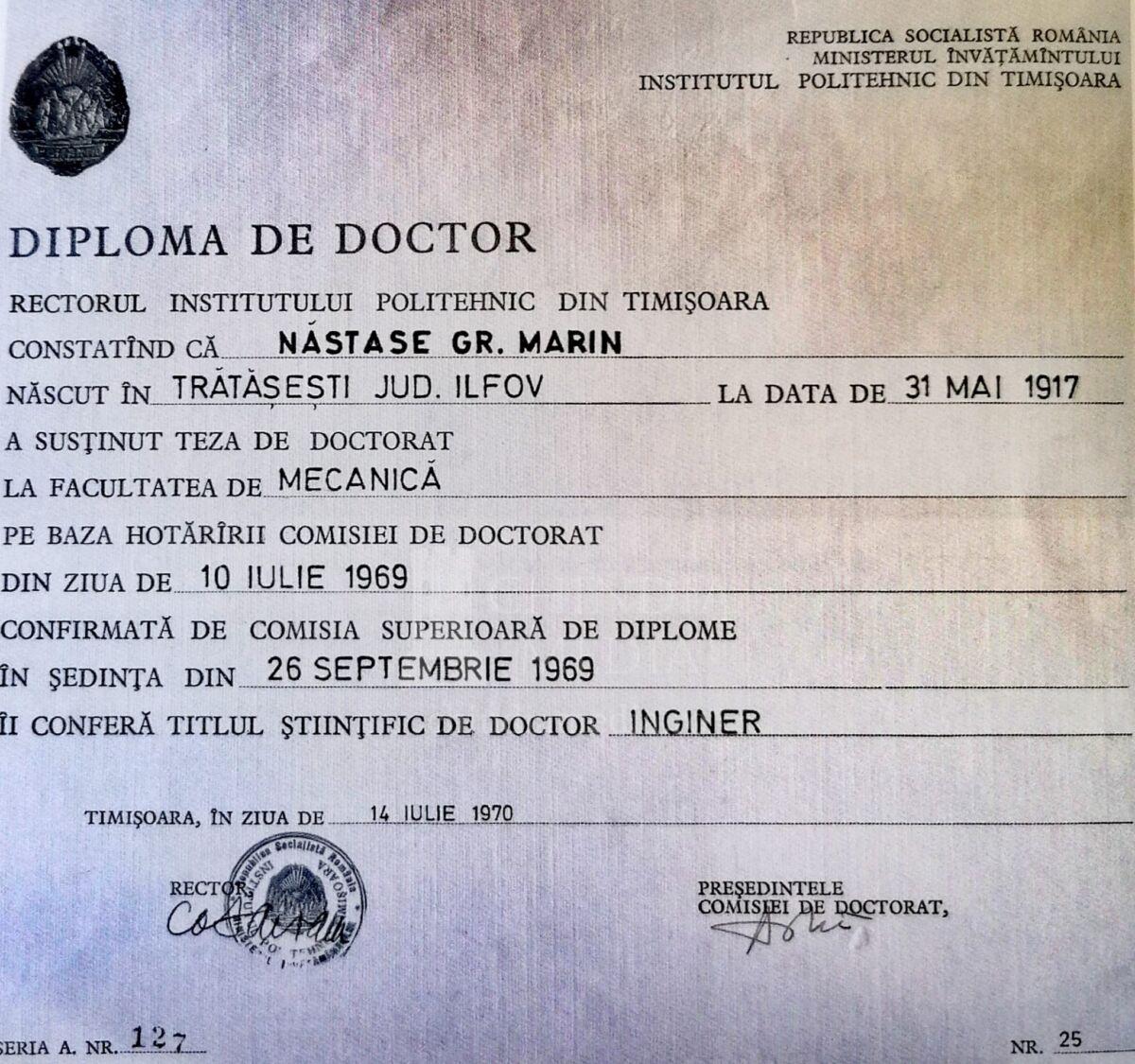 În data de 26 septembrie 1969 a obținut titlul de doctor la Facultatea de Mecanică a Institutului Politehnic din Timișoara, cu teza „Contribuții în defectoscopia cu radiații electromagnetice penetrante”. Pe linie militară este avansat la gradul de maior. De asemenea, desfășoară activitate și la Ministerul Educației și Învățământului unde, în perioada 1972-1977 a deținut funcția de director în cadrul Direcției Învățământ superior și cercetare științifică. La 6 decembrie 1972, Marin Gr. Năstase obține certificatul de inventator pentru soluția „Dispozitiv reglabil pentru control vizual”, iar în toată cariera sa, dr.ing. Marin Năstase a colaborat cu nume importante ale științei din România, cum ar fi acad. Elie Carafoli (1901-1983), acad. Prof.dr.docent Ștefan Marius Milcu (1903-1997) și acad. Nicolae Cajal (1919-2004). După ieșirea la pensie este avansat la gradul de locotenent colonel (r) în anul 1990 și colonel (r) în 1994. A decedat la 2 aprilie 1995 la București, fiind înmormântat în Cimitirul Ghencea Militar.