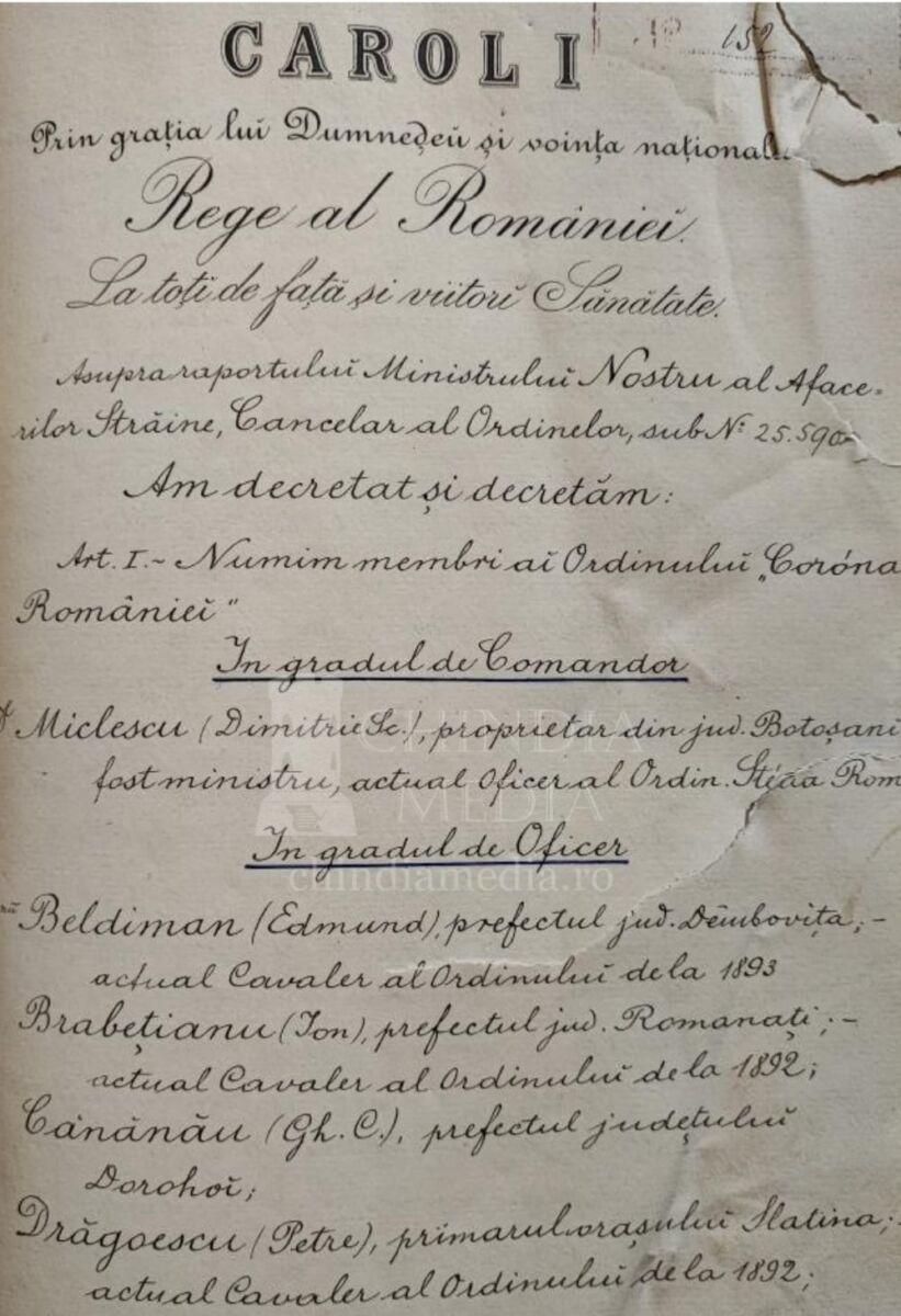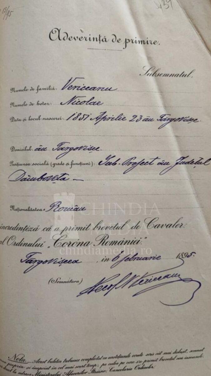 Urmare a adresei ministrului de Interne nr. 51.437 din 28 decembrie, precum și urmare a raportului ministrului Afacerilor Străine, cancelar al Ordinelor, nr. 25.590 din 31 decembrie 1894, regele Carol I a semnat în București, la 1 ianuarie 1895, decretul nr. 13 (aflat la Arhivele Naționale Istorice Centrale, Ministerul Afacerilor Externe. Cancelaria Ordinelor, dosar nr. 52/1895), prin care acorda lui Vericeanu Nicolae, subprefect în județul Dâmbovița, precum și altora, Ordinul „Coroana României” în gradul de Cavaler. Conform adeverinței de primire a brevetului de Cavaler al Ordinului „Coroana României”, semnată la Târgoviște, în 6 februarie 1895, subprefectul s-a născut la 23 aprilie 1851, în Târgoviște și își avea domiciliul în aceeași localitate.