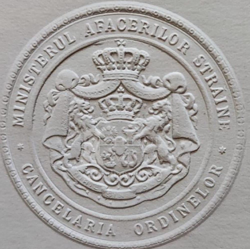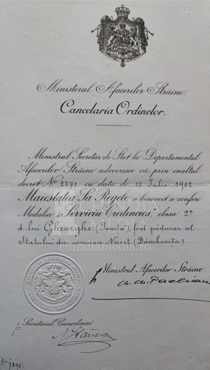 Din adeverința nr. 7895 (aflată la Arhivele Naționale Istorice Centrale, Ministerul Afacerilor Externe. Cancelaria Ordinelor, dosar nr. 89/1902), Cancelaria Ordinelor adeverește că, prin Decretul regal nr. 2.271 din 15 iulie 1902, regele Carol I a conferit Medalia „Serviciul Credincios” clasa a II-a lui Gheorghe Ioniță, fost pădurar al Statului din comuna Nucet, județul Dâmbovița. Adeverința, semnată de ministrul Afacerilor Străine și de secretarul Cancelariei, este validată cu sigiliul timbrat fix care are în emblemă stema României de la 1872 (cu modificările înfăptuite prin uz după ridicarea României la rangul de regat în anul 1881) și în exergă legenda: * MINISTERUL AFACERILOR STRĂINE * CANCELARIA ORDINELOR. Decretul de mai sus, în care au mai fost menționați că au primit distincția, printre alții, Edu Niță și Iancu Dinu, foști pădurari ai Statului din comuna Pucioasa (Dâmbovița), a fost publicat în „Monitorul Oficial” nr. 88 din 24 iulie / 6 august 1902, p. 3146.
