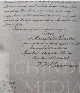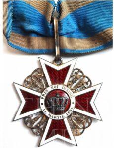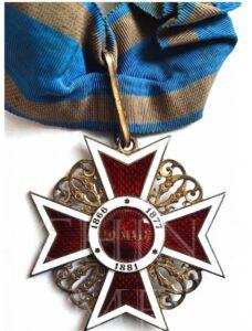 Ordinul „Coroana României”, instituit în 10 mai 1881, avea scopul de a recompensa serviciile aduse statului. Potrivit Regulamentului pentru punerea în aplicare a legii relativă la instituirea Ordinului „Coroana României” (Decretul nr. 3.506 din 11 octombrie 1906, aflat, în copie, la Arhivele Naționale Istorice Centrale, Ministerul Afacerilor Externe. Cancelaria Ordinelor, dosar nr. 642), Ordinul „Coroana României”: „este o cruce cu brațe egale; fiecare braț este de smalț roșu, având împrejur o dungă de smalț alb; între brațe, cifra Maiestății Sale Regelui. În mijlocul Crucii, în față și în dos, este un medalion de smalț roșu, cu un cerc de smalț alb, împrejurul medalionului. Pe smalțul roșu, în față, se află coroana regală, de oțel (făurită din metalul unuia dintre tunurile luate ca trofee de la inamic, în bătălia de la Plevna de la 28 noiembre 1877), iar pe cercul de smalț alb este scris, în partea de sus: PRIN NOI ÎNȘINE, iar în partea de jos: 14 MARTIE 1881 (data proclamării regatului). Reversul (dosul) medalionului poartă scris, la mijloc, pe smalțul roșu, în linie orizontală: 10 MAI (data încoronării) și împrejur, pe cercul de smalț alb: 1866-1877-1881 (datele respective ale suirii pe Tron, proclamării Independenței și proclamării Regatului). Cifra regală, între brațele crucii, ca și montura crucii, este de argint pentru Cavaleri și de aur pentru celelalte grade. Diametrul Crucii este de 40 mm pentru Cavaleri și Ofițeri și de 60 mm pentru Comandori și Mari-Ofițeri. Însemnele Ordinului „Coroana României” sunt atârnate de o panglică moarată, de culoare albastru-închis, cu câte o dungă pe fiecare margine de culoarea oțelului, dunga lată de 6 mm la Cavaleri și Ofițeri; de 8 mm la Comandori și Mari-Ofițeri și de 20 mm la Mari-Cruci. Panglica la Comandori și Mari-Ofițeri este lată de 45 mm și de o lungime egală cu periferia gâtului”.