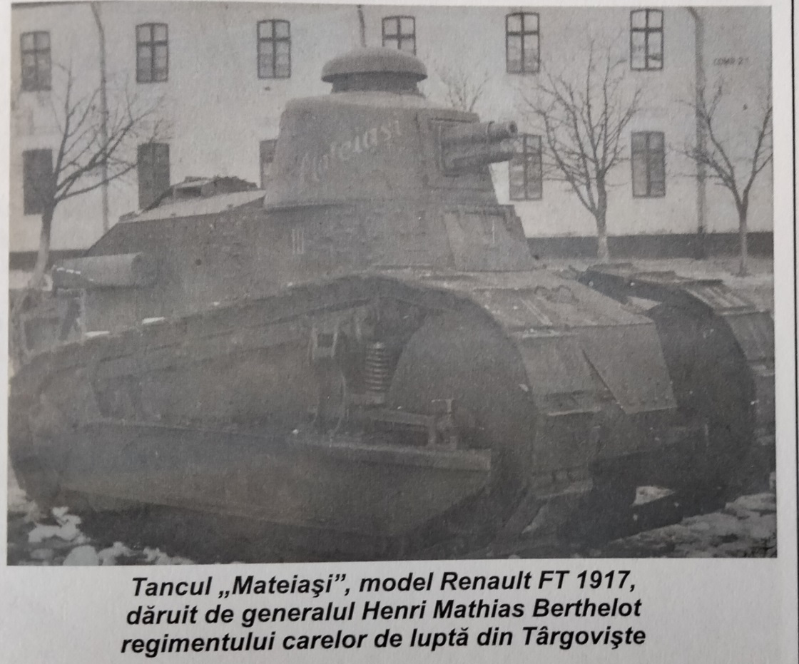 O imagine document, fotografie de epocă are în centrul ei pe generalul Berthelot, suita sa, ofițerii și cadrele didactice de la celebrul liceu chiar la intrarea din clădirea principală. Merită reținut și un lucru mai puțin comentat. Cu această ocazie , oaspetele de marcă al Târgoviștei a oferit garnizoanei un tanc franțuzesc model Renault FT 1917, pe a cărui turelă era scris cuvântul ,,Mateiaș”. Era o dovadă a aprecierii făcute față de ostașii dâmbovițeni din Regimentul 22 și 62 Infanerie, care luptaseră cu vitejie și sacrificiu pentru apărarea orașului Câmpulung în toamna anului 1916.