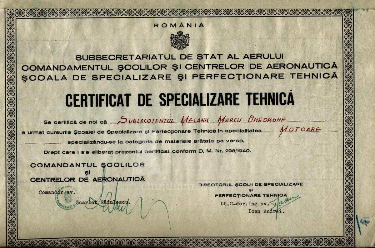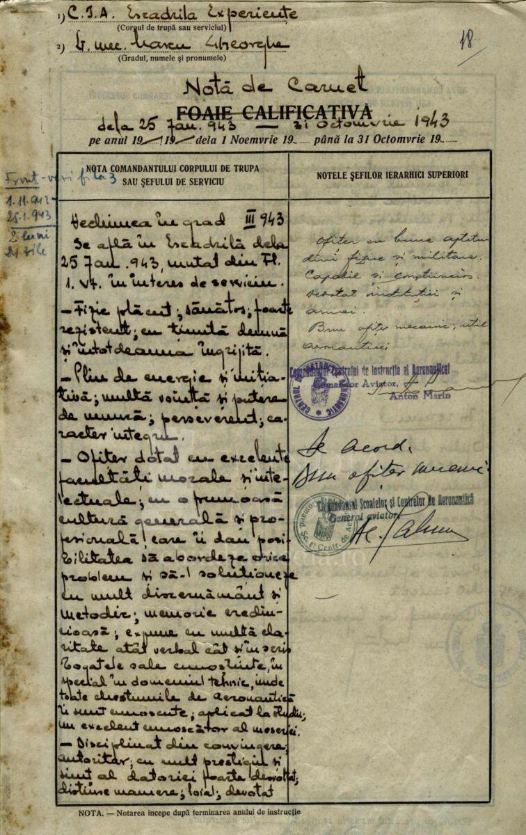 Începând cu 25 ianuarie 1943, a fost detaşat în cadrul CIA, la Escadrila de Experienţe, unde s-a distins printr-o activitate remarcabilă. În urma acesteia, cpt.av. Moţiu Gheorghe, comandantul escadrilei, referindu-se la lt.av. Marcu Gheorghe, consemna în foaia calificativă: „Fizic plăcut, ţinuta demnă şi întotdeauna îngrijită. Plin de energie şi iniţiativă, multă voinţă şi putere de muncă, perseverent, caracter integru. Educaţie morală excelentă, profesional şi intelectual pregătit, rezolvă cu discernământ orice problemă tehnică, metodic, memorie foarte bună, aplecat spre studiu. Disciplinat din convingere, extrem de modest. S-a identificat complet cu misiunea escadrilei de experienţe pentru care a depus multă muncă, fără să precupeţească nici un efort. Îndrăgostit de zbor, a reuşit să adune 50 de ore de pilotaj. Ofiţer dotat cu excepţionale calităţi morale şi intelectuale s-a dovedit şi în această escadrilă un admirabil colaborator şi un excelent ofiţer mecanic. Prevăd ofiţerului o strălucită carieră….”.