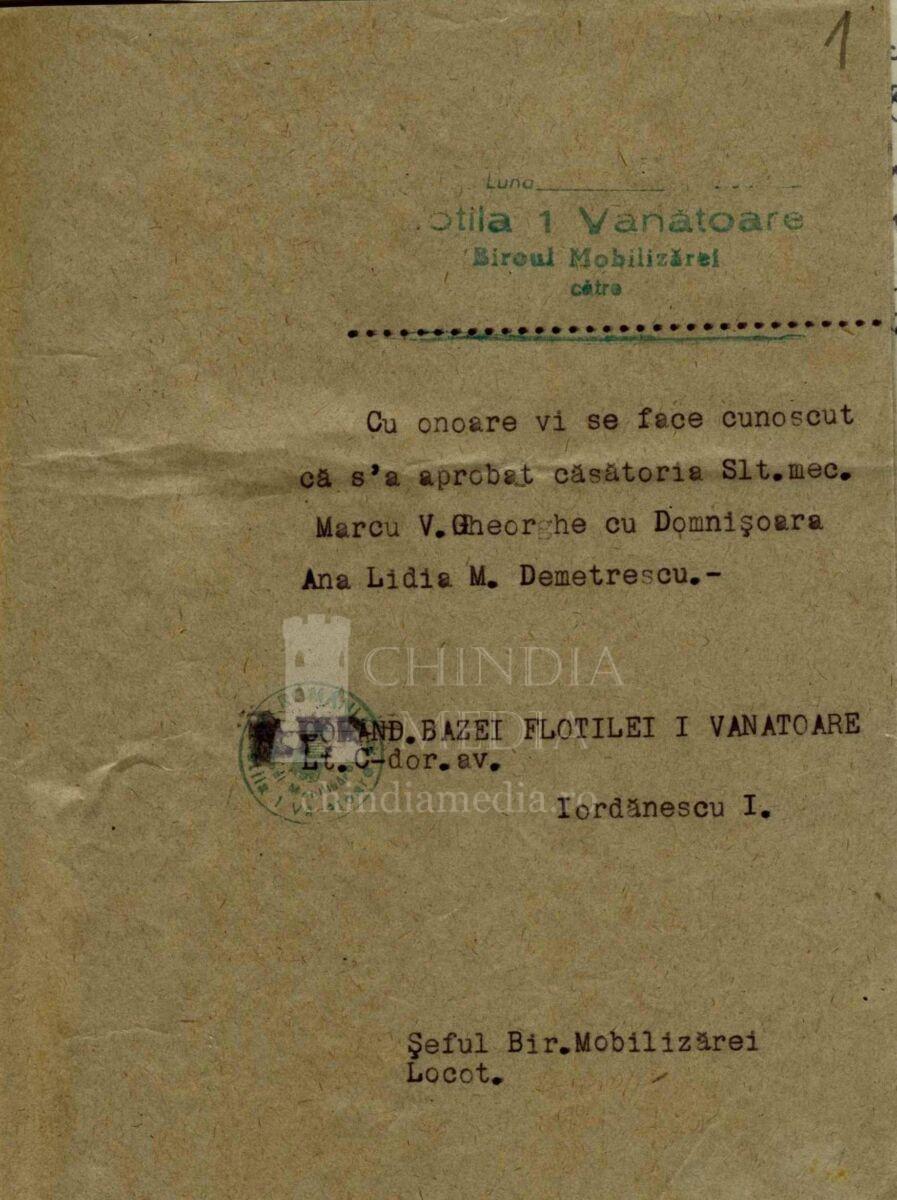 La începutul anului 1942, slt.mec. Marcu V. Gheorghe solicita comandantului Bazei Flotilei 1 Vânătoare, lt. comandor av. Iordănescu, aprobarea căsătoriei cu Ana Lidia Demetrescu, studentă a Facultății de Drept din București, fiica inginerului Marin Demetrescu, Inspector General în Ministerul Agriculturii și Domeniilor, așa cum reiese din Certificatul de căsătorie civilă nr. 2499/1942, înregistrat la 4 februarie 1942 de primăria București, sector II.