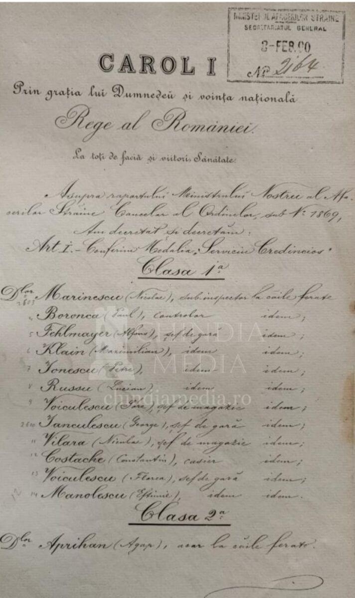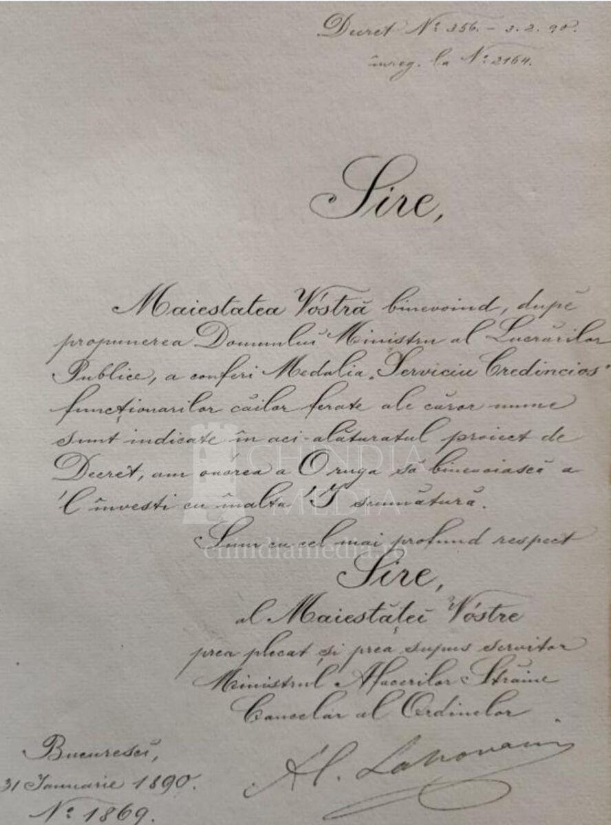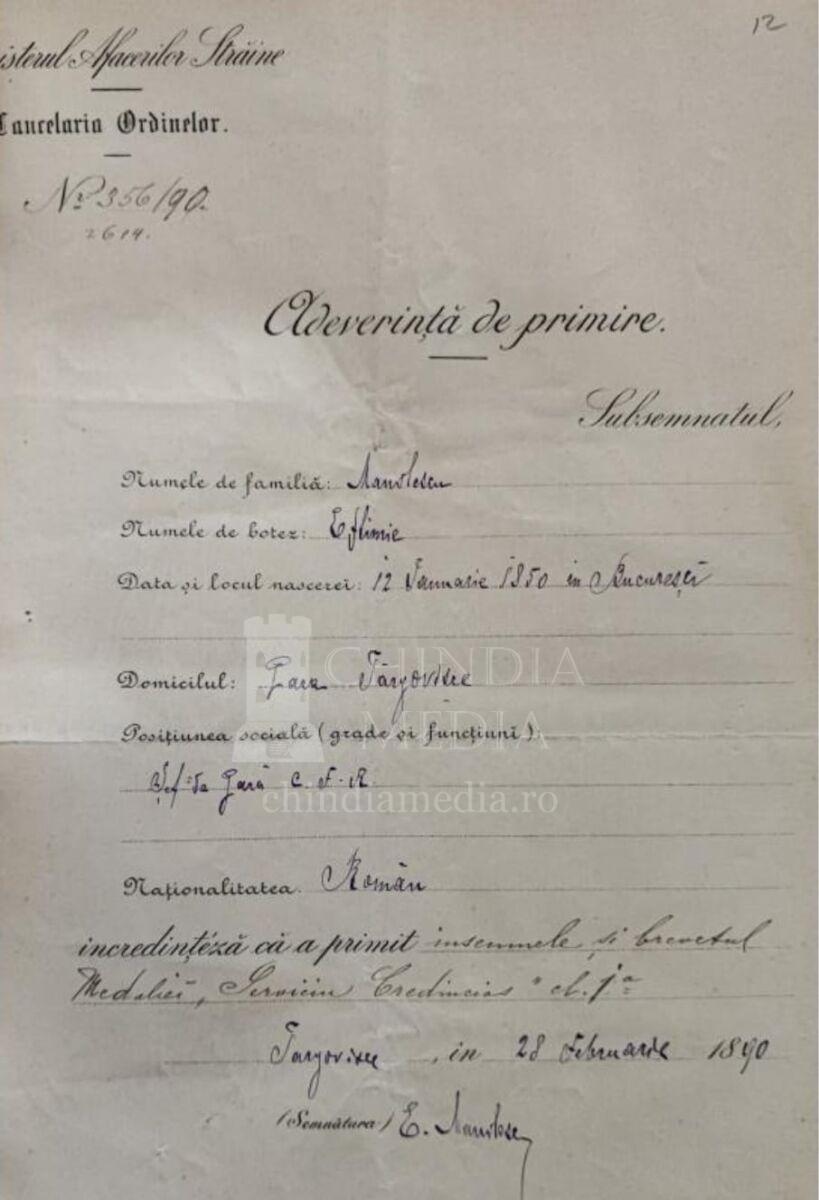 Urmare a raportului lui Al. Lahovari, ministrului Afacerilor Străine, cancelar al Ordinelor, nr. 1.869 din 31 ianuarie 1890, regele Carol I a semnat în București, la 3 februarie 1890, decretul nr. 356 (aflat la Arhivele Naționale Istorice Centrale, Ministerul Afacerilor Externe. Cancelaria Ordinelor, dosar nr. 502/1890), prin care îi acorda lui Manolescu Eftimie, șef de gară din Târgoviște, Medalia „Serviciul Credincios” clasa I. Prin același act normativ, s-au conferit și altor persoane, atât medalia menționată mai sus, cât și Medalia „Serviciul Credincios” clasa a II-a. Potrivit adeverinței de primire a însemnelor și brevetului Medaliei „Serviciul Credincios” clasa I, semnată la Târgoviște, în 28 februarie 1890, Manolescu Eftimie s-a născut la 12 ianuarie 1850, în București și își avea domiciliul în Gara Târgoviște.