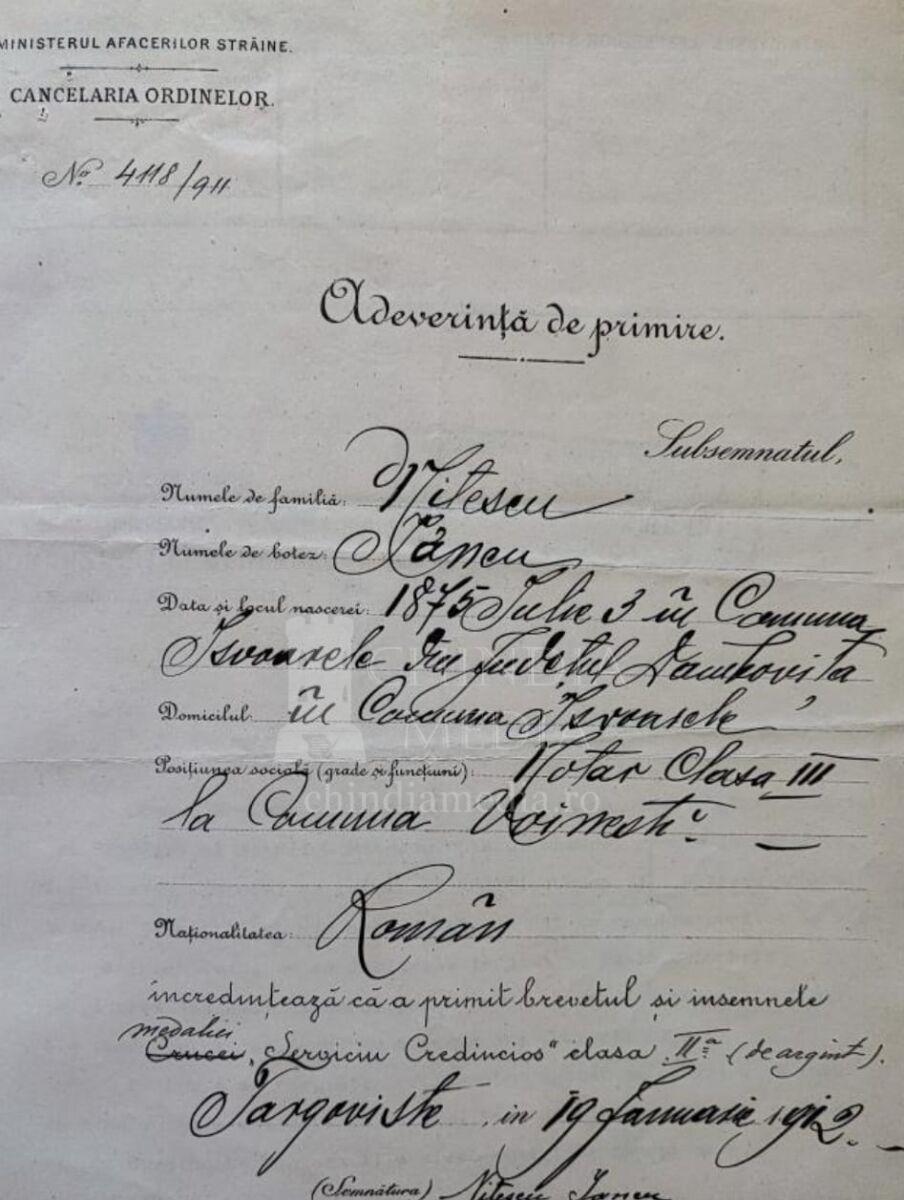 EDITORIAL: Medalia „Serviciul Credincios” decernată în 1911 notarului comunei Voinești, județul Dâmbovița