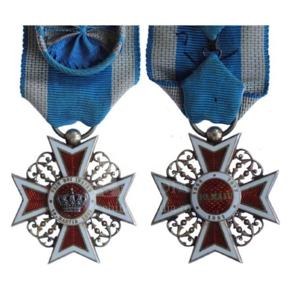Medalionul este înconjurat de o bordură, smălțuită alb, în care s-a scris cu litere și cifre aurii: * PRIN NOI ÎNȘINE * 14 MARTIE 1881. Pe revers, într-un medalion asemănător cu cel de pe avers, s-a scris, orizontal, cu cifra și litere aurii, 10 MAIU (data încoronării) și, împrejur, în bordura albă, de asemenea, cu auriu: * 1866 * 1877 * 1881. Cifra regală, între brațele crucii, ca și montura crucii, sunt de aur pentru Ofițeri. La Ofițeri, panglica este de culoare albastru-închis, cu câte o dungă pe fiecare margine de culoarea oțelului, lată de 6 mm, având deasupra o rozetă cu un diametru de 25 mm.