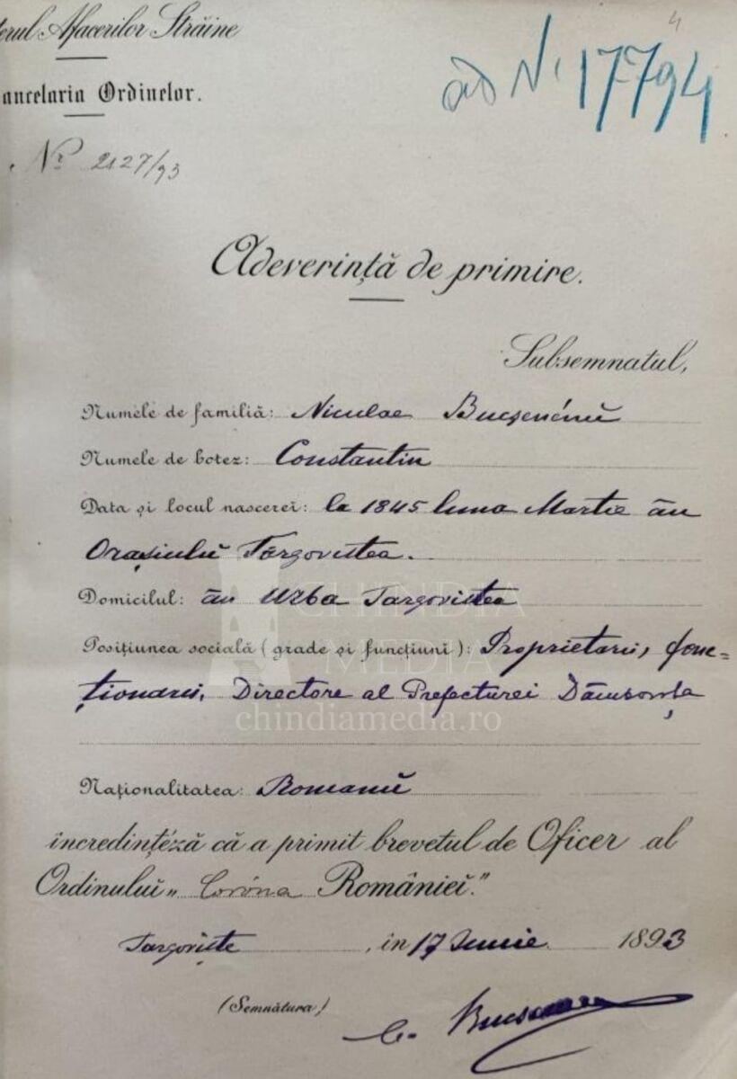 Urmare a raportului lui Al. Lahovari, ministrul Afacerilor Străine, cancelar al Ordinelor, nr. 9.434 din 19 mai 1893, regele Carol I a semnat în București, la 22 mai 1893, decretul nr. 2.127 (aflat la Arhivele Naționale Istorice Centrale, Ministerul Afacerilor Externe. Cancelaria Ordinelor, dosar nr. 49/1893), prin care acorda lui Bucșăneanu Constantin, directorul Prefecturii Dâmbovița, Ordinul „Coroana României” în gradul de Ofițer. Potrivit adeverinței de primire a brevetului de Ofițer al Ordinului „Coroana României”, semnată la Târgoviște, în 17 iunie 1893, beneficiarul decorației s-a născut în luna martie 1845, în orașul Târgoviște și își avea domiciliul în aceeași localitate. Distincția a mai fost acordată și altor persoane, atât în gradul amintit mai sus, cât și în gradele de Comandor și de Cavaler.