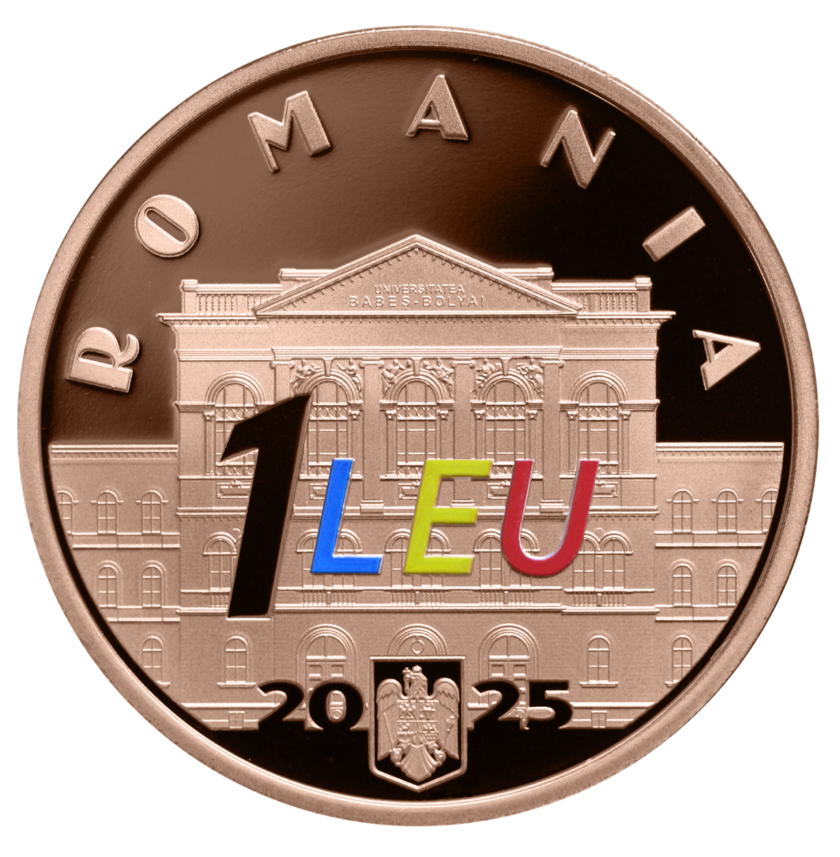 Aversul monedei prezintă frontonul Universității „Babeș-Bolyai” din Cluj-Napoca, inscripția „ROMANIA” în arc de cerc, valoarea nominală „1 LEU”, stema României și anul de emisiune „2025”.