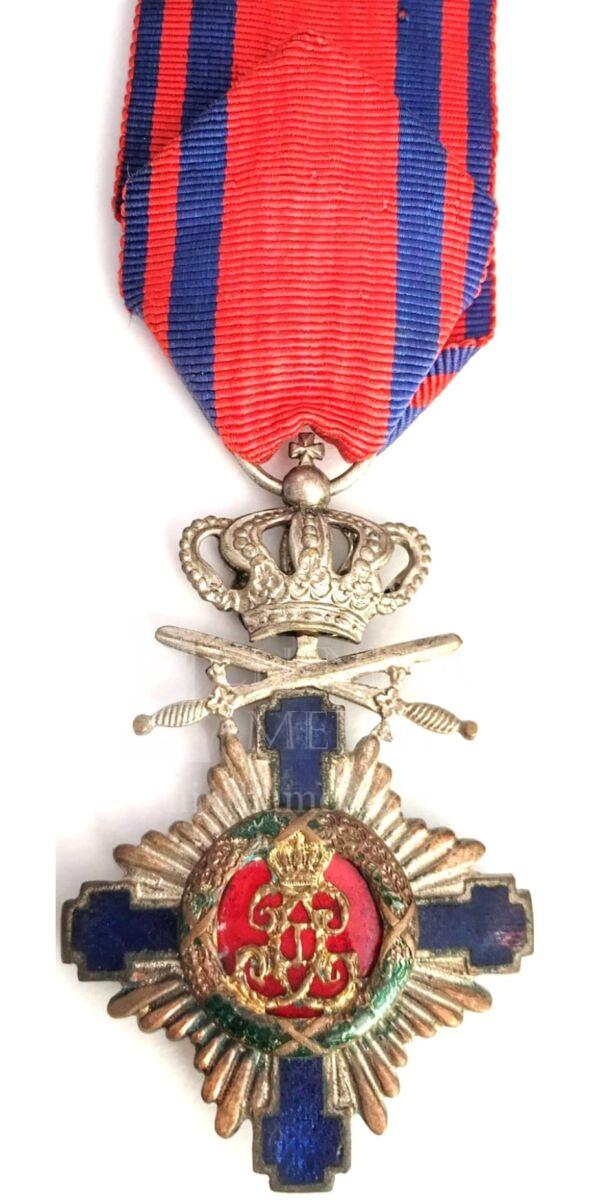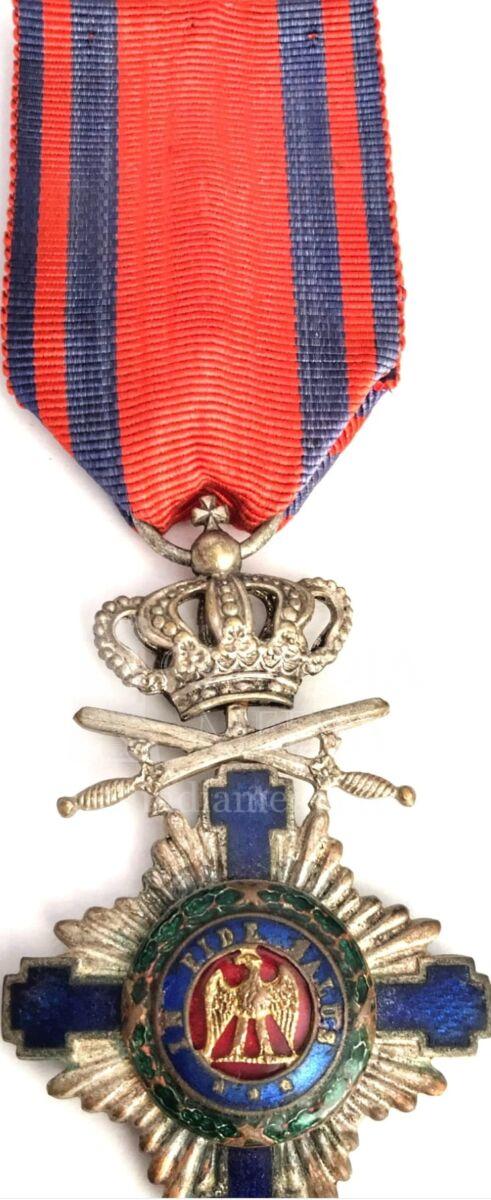 Centrul crucii este de smalț roșu, înconjurat cu ramuri de stejari verzi, având pe o parte vulturul cu deviza IN FIDE SALUS, iar pe cealaltă parte cifra regelui Carol I (două litere „C” adosate și intercalate în care este înscrisă cifra romană „I”) încoronată de o coroană închisă, terminată cu glob crucifer, totul aurit. Crucea, cu smalț albastru, este, pentru Cavaleri, de argint și cu diametrul de 40 milimetri. Cavalerii poartă decorațiunea pe partea stângă a pieptului, atârnată de o cordea moarată roșie, cu marginile albastre-închis, fără rozetă. Pentru militari, forma decorației este tot ca cea pentru civili, cu diferența numai că fiecare clasă are pe decorațiune două spade suspendate deasupra crucii».