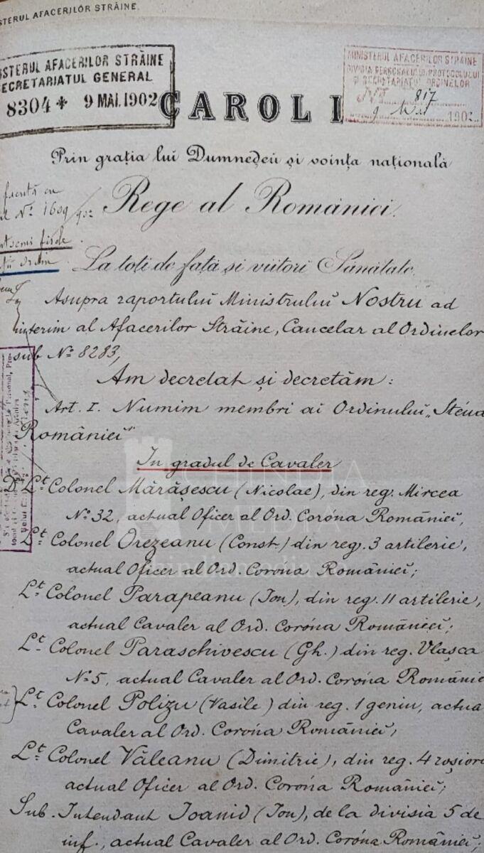 Urmare a raportului ministrului ad-interim al Afacerilor Străine, cancelar al Ordinelor, nr. 8283/1902, regele Carol I a semnat în București, la 9 mai 1902, decretul nr. 1.610 (aflat la Arhivele Naționale Istorice Centrale, Ministerul Afacerilor Externe. Cancelaria Ordinelor, dosar nr. 87/1902), prin care acorda căpitanului Pelimon Romulus, din Regimentul 3 Dâmbovița № 22, Ordinul „Steaua României” în gradul de Cavaler, cu dreptul de a purta însemnele militare. Prin același act normativ, decorația, în același grad, s-a conferit și altor militari.