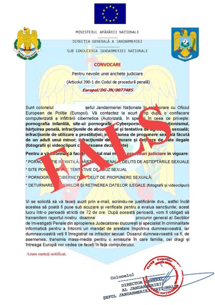 Datele prezentate în mesaje sunt false și nu provin din partea Jandarmeriei Române.
