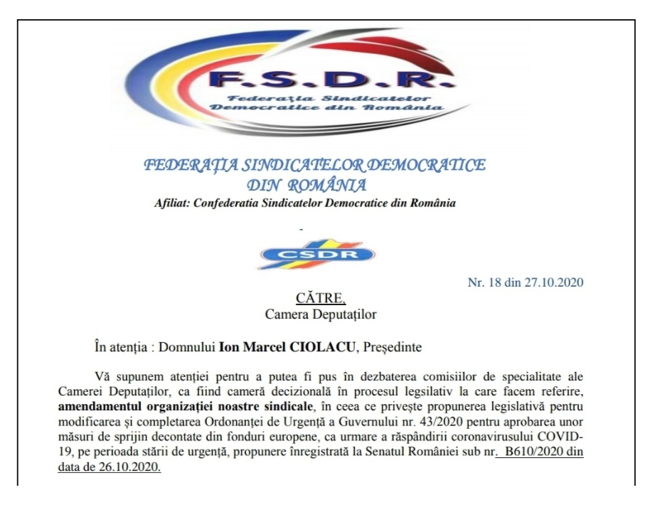 La data de 26.10.2020, a fost înregistrată la Senatul României propunerea legislativă a 3 deputați PSD privind completarea art. 7 din Ordonanta de urgenta a Guvernului nr. 43/2020 pentru aprobarea unor masuri de sprijin decontate din fonduri europene, ca urmare a raspandirii coronavirusului.