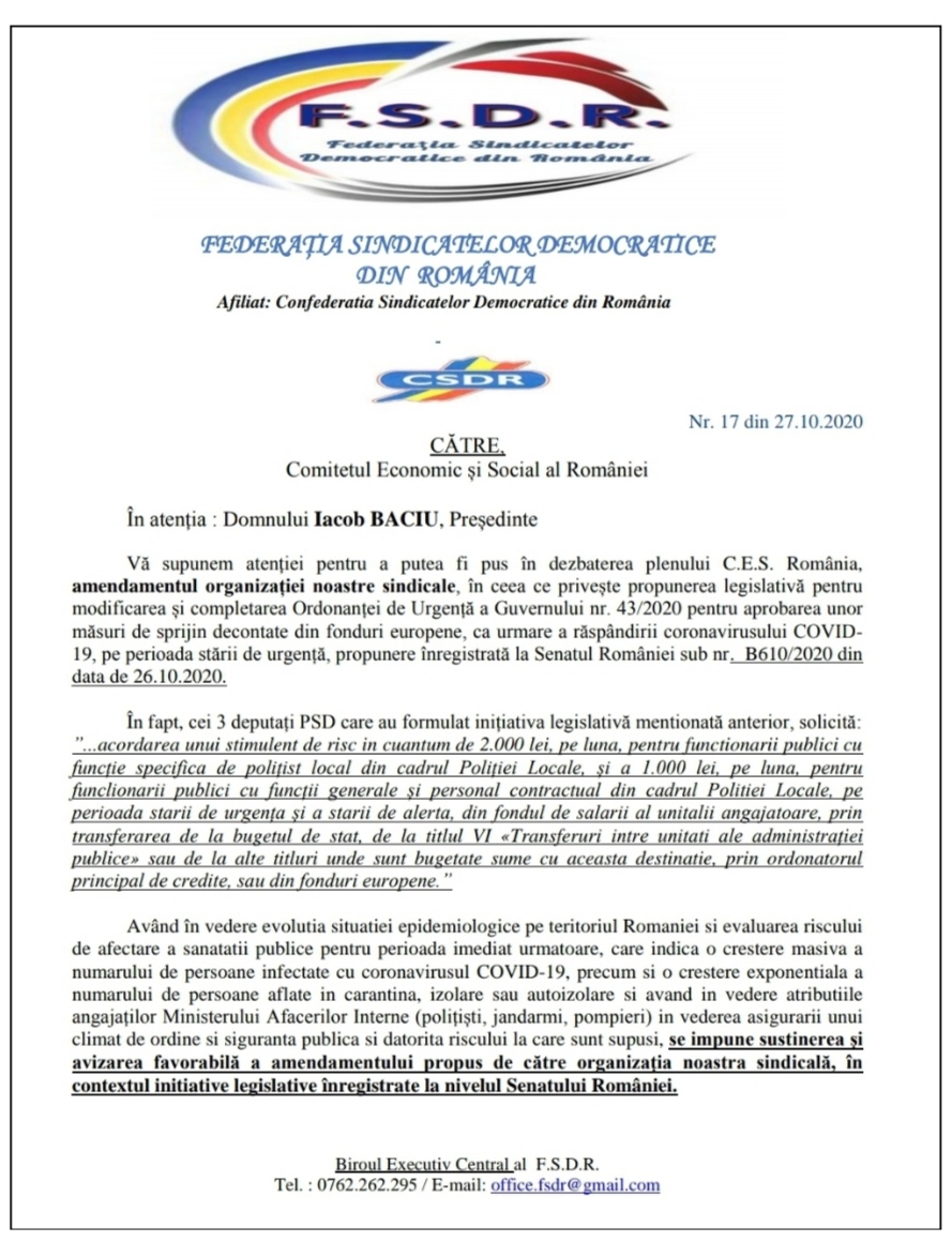 Având în vedere faptul că, angajații Ministerului Afacerilor Interne (polițiști, jandarmi, pompieri) sunt prinși în toate activitățile referitoare la măsurile impuse pe perioada stării de urgență/alertă și sunt supuși riscului de infectare cu noul coronavirus COVID-19, nefiind incluși în propunerea legislativă de acordare a stimulentului de risc, organizația noastră sindicală a făcut demersuri către Consiliul Economic si Social al României și către Camera Deputaților, care este cameră decizională pe O.U.G. 43/2020 pentru acordarea stimulentului de risc si personalului M.A.I. care se află în prima linie în lupta anti-covid.