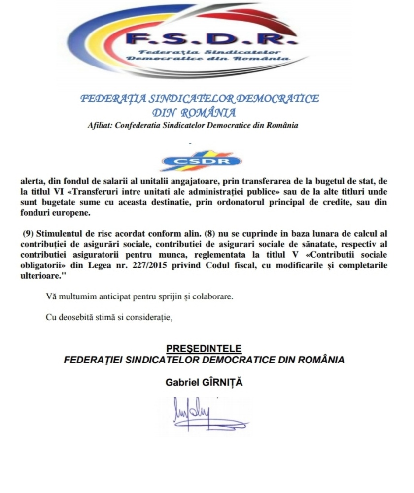 Luând în considerare toate aspectele mentionate mai sus și faptul că încă o dată polițiștii si nu numai, sunt lăsați de izbeliște, guvernanții, parlamentarii si factorii decidenți din structurile de resort dând dovadă de nepăsare, atragem atenția asupra pericolului cauzat de o eventuală blocare a activității polițienești, mai ales în aceste vremuri grele pentru toți românii, atunci când principala structura de forță în lupta anticovid a fost cea a M.A.I și personalul medical și solicităm ”aplecarea” asupra amendamentului adus proiectului legislativ pentru acordarea stimulentului de risc si personalului M.A.I., în caz contrar, toate structurile componente ale federației noastre sindicale și cu sprijinul confederației la care suntem afiliați, cât și ceilalți parteneri din structurile asociative ale Poliției Române, vom lua măsuri drastice de sanctionare a clasei politice, în special în contextul proximității alegerilor parlamentare, atunci când este atâta nevoie de acesti angajați ai ministerului.