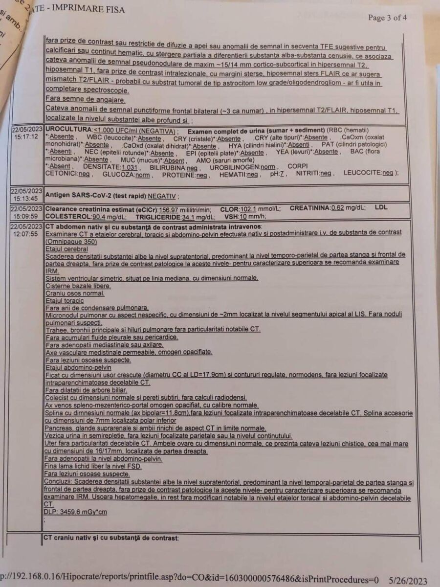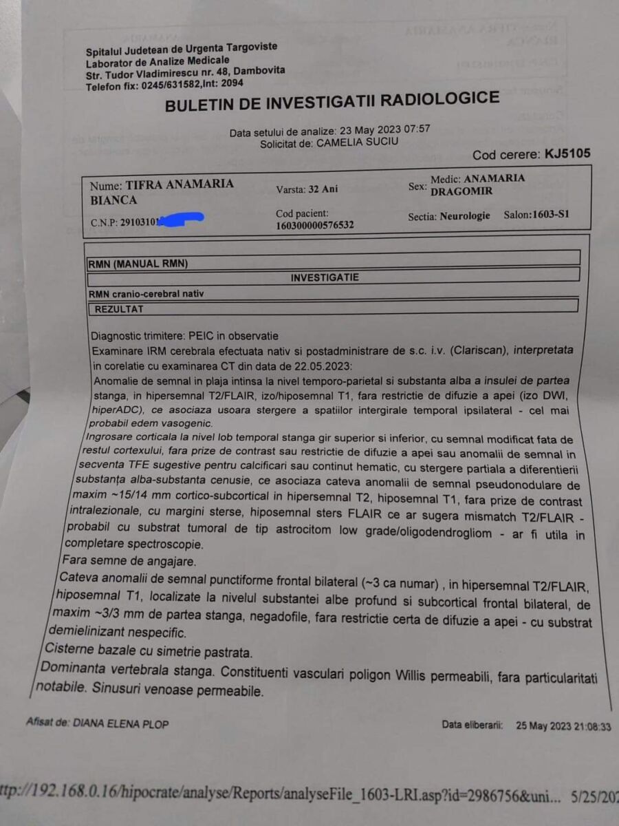 Nemaiputând suporta, Bianca s-a prezentat la UPU Târgoviște, unde a primit un diagnostic devastator: Tumoră malignă pe creier, descoperită la CT.